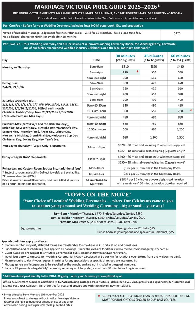 Please note – the Government issued final processed Marriage Certificate will be obtainable from www.bdm.vic.gov.au for a small fee. Please check their site for details.